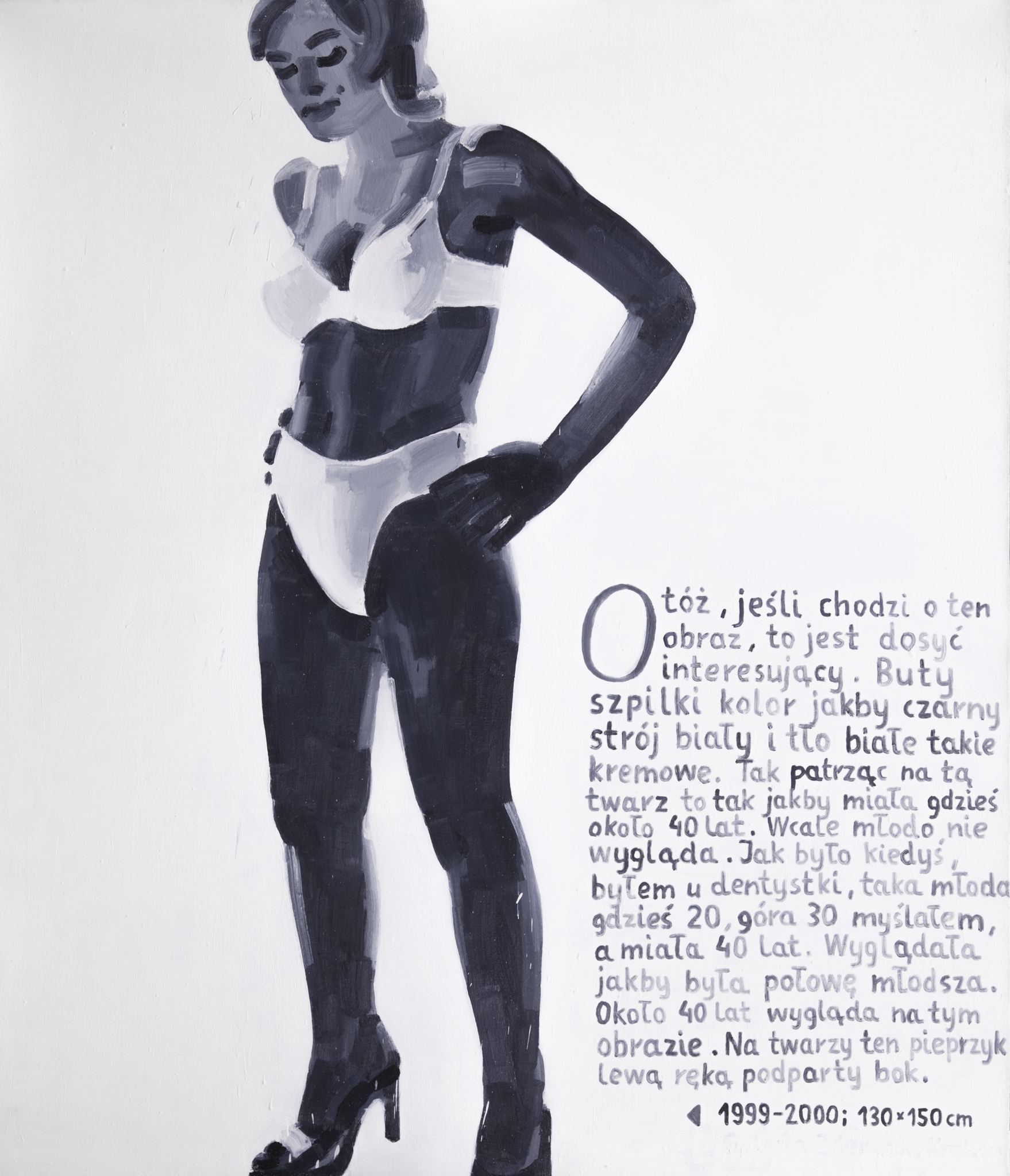 Artysta korzysta z optyki brukowców, używanej do banalnego obrazowania rzeczywistości. Tutaj postać kobiety „nie zmieściła się” na obrazie. Stopa i głowa powyżej linii włosów zostały „odcięte”. Zastosowana żabia perspektywa sprawia, że uwaga widza zostaje skierowana na zajmujące ponad połowę kadru długie nogi. Biała bielizna wtapia się w tło, wyodrębniając malowane ciemną farbą pojedyncze części ciała. Obraz może być interpretowany w kontekście popularnego w mediach przedmiotowego przedstawiania kobiety oraz fetyszyzacji części jej ciała lub uatrakcyjniających ją atrybutów.